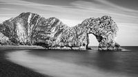Een Zwart-Wit foto van een zonsondergang bij Durdle Door (soms geschreven Durdle Dor), een natuurlijke kalkstenen boog aan de Jurassic Coast in de buurt van Lulworth in Dorset, Engeland.