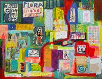Art brut collage van spontane tekeningen. Geïnspireerd door Basquiat, Dubuffet en Rik van Iersel. Waarom? Omdat ze vrij werken, tekenen en schilderen vanuit het onderbewustzijn. Het spontane, vrije kinderlijke zie je terug in deze collage in gemengde technieken (mixed media).