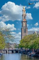 Een uniek beeld van de beroemde Westertoren in Amsterdam en een DC 3, ook wel bekend als de Dutch Dakota, die pal langs de toren van de westerkerk vliegt. Ook de Prinsengracht - onderdeel van de grachtengordel - is goed in beeld gebracht op een zonnige lentedag.