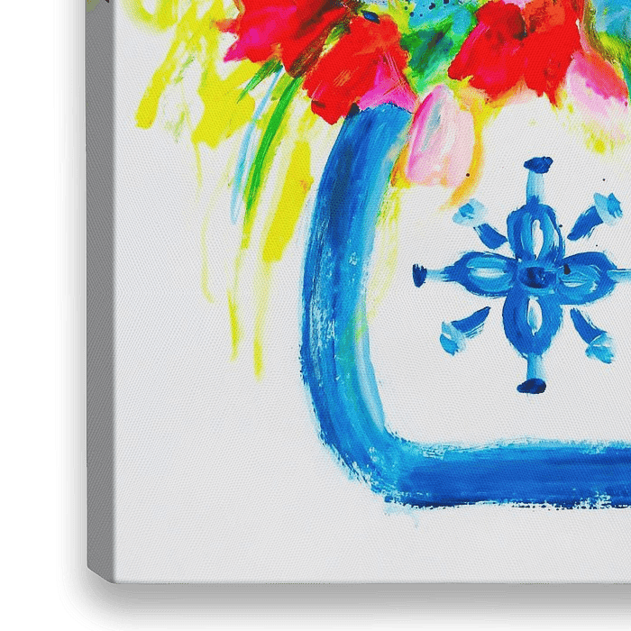 In dit kunstwerk staan speels geschilderde bloemen in een klassieke Delftsblauwe vaas centraal. De…
