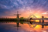 De brug naar een van de molens bij Kinderdijk tijdens een schitterende zonsondergang.