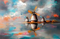 Windmolens aan een rivier, met een lucht vol wolken en hun weerspiegeling in het water. Het kleurenschema heeft lichtoranje,roze en blauw en turquoise tinten.