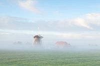 Charming Dutch windmill in the morning fog. Groningen, the Netherlands