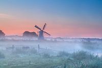 Typisch Nederlands sunrise - pastoraal, windmolen en mist. Witte Molen, Groningen, Nederland