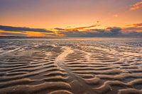 Mooie zonsondergang aan de Nederlandse kust bij de Maasvlakte Rotterdam. Mooie patronen in het zand met op de achtergrond een mooie zonsondergang en bewolking.