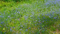 Weiland met blauwbloeiend hardnekkig vlas in de zon