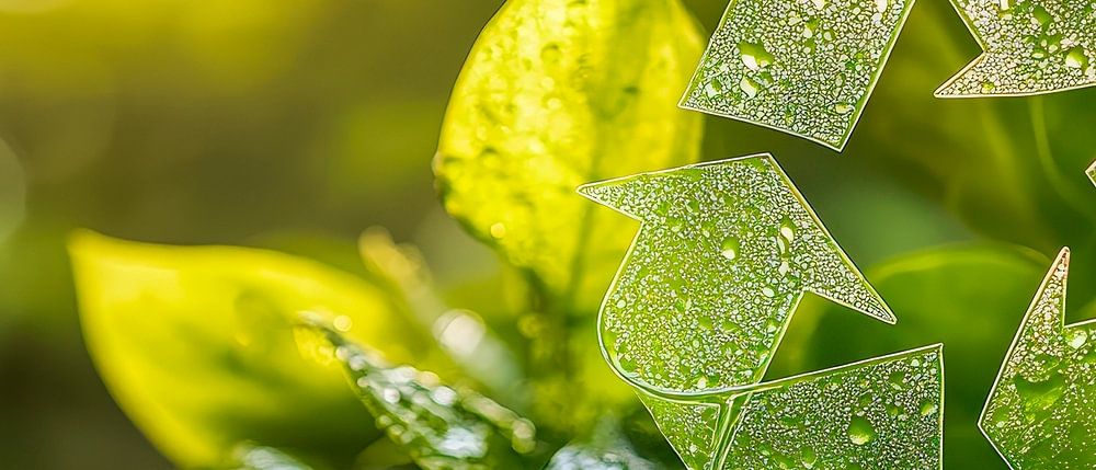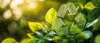 Het recyclingsymbool schittert te midden van frisse, weelderige groene bladeren en symboliseert harmonie en duurzaamheid. De glinsterende waterdruppels brengen de natuur tot leven en geven de kamer een verfrissend tintje. Deze afbeelding is perfect voor de woonkamer of keuken en straalt een gevoel van frisheid en milieubewustzijn uit.