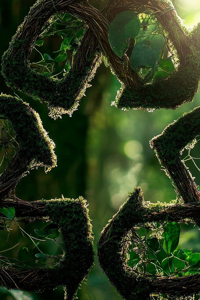 Een artistiek recyclingsymbool schittert te midden van weelderige groene bladeren, omringd door levende natuur. Het zachte licht dat door de bomen valt geeft de afbeelding een bijna magische uitstraling. Ideaal voor op kantoor of in de woonkamer, het inspireert tot milieubewust denken en creëert een harmonieuze verbinding met de natuur.