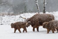 De kleine Schotse hooglander krijgt een duwtje om verder te lopen door de sneeuw.