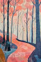 Een uitnodigende boswandeling op een knisperende herfstdag, waar kleuren zich mengen en de lucht voelt alsof het elk moment kouder kan worden. De bomen staan strak in hun silhouetten, terwijl roze en oranje tinten het pad omlijnen. Hier voel je de rustige melancholie van het seizoen – een mix van afscheid en verwachting, precies wat je soms nodig hebt om je gedachten de vrije loop te laten.