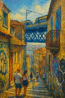Dit digitale olieverfschilderij verbeeldt een levendige steeg in Porto die zich steil naar beneden slingert, waar voorbijgangers in het zonlicht langzaam hun weg naar de rivier vinden. De oude gevels, met verweerde muren en kleurrijke graffiti, geven de plek een rauwe maar authentieke uitstraling, die typerend is voor de stad.