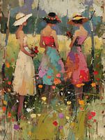 Dwalen in een veld vol bloemen, kleurrijk portret van drie vrouwen. Een bijzondere blikvanger voor je interieur! Kies zelf het formaat en materiaal bij dit werk.