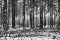 Dwarrelende sneeuw in het bos, abstract.