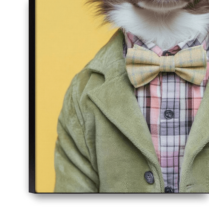Tegen een felgele achtergrond schittert een stijlvolle miniatuur mierenhond in een elegant groen jasje en een charmant strikje. Zijn nieuwsgierige blik en pluizige oren geven hem een authentieke dandy uitstraling, terwijl het geruite overhemd feestelijk contrasteert met de speelse outfit. Een echt hondenidool dat charme en elegantie…