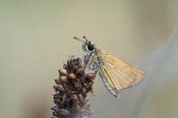 Een dwergdikkopje in de vegetatie. Gemaakt in natuurgebied Oosterheide.