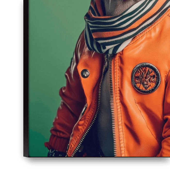 Een stijlvolle Miniature Bull Terrier, gekleed in een opvallende oranje jas, straalt coole charme uit. Met een modieuze zonnebril die zijn brutale grijns benadrukt en een chique sjaal om zijn nek combineert hij onconventionele stijl met onweerstaanbaar charisma. De levendige groene achtergrond maakt hem een echte blikvanger!
