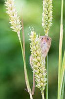 Deze dwergmuis, die van nature graag in graan stengels klimt, was aan het balanceren om boven te blijven. De muis steekt lekker af in de groene omgeving