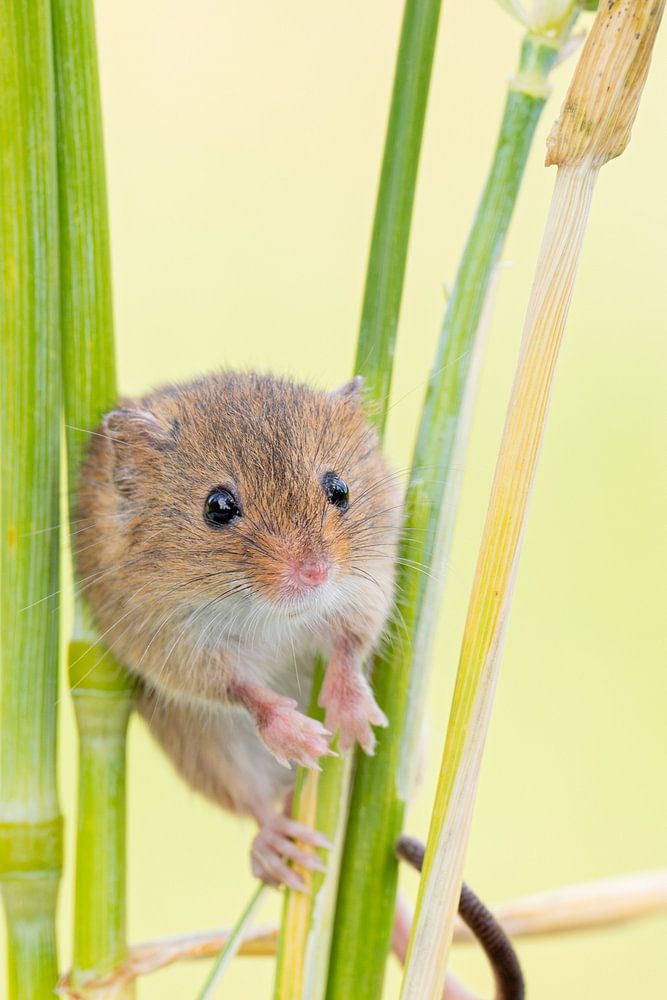 Deze dwergmuis, die van nature graag in graan stengels klimt, was aan het balanceren om boven te blijven. De muis steekt lekker af in de groene omgeving