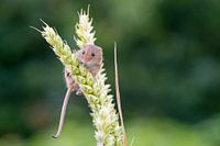 Deze dwergmuis, die van nature graag in graan stengels klimt, was aan het balanceren om boven te blijven. De muis steekt lekker af in de groene omgeving