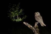 Dwergooruil (Otus scops) in zit op een boomstam met een verlichte boom op de achtergrond.