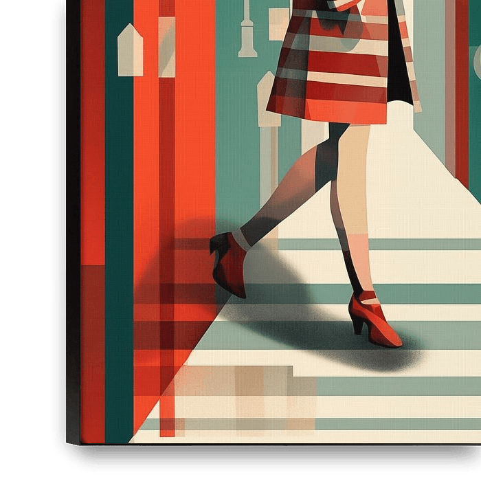 Een spel van dynamiek en evenwicht, waar grafische strepen en zachte vrouwelijke silhouetten samensmelten tot een harmonieus geheel. Dit kunstwerk belichaamt de perfecte balans tussen kracht en zachtheid.
