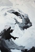 In een virtuele dans van zwart en wit ontvouwt zich een spiralende beweging die de kijker meesleept in een indringend spel van licht en schaduw. De dynamische penseelstreken lijken mysterieus en levendig, terwijl ze vanuit een onverwachte stilte emoties en verhalen oproepen. Een spel van chaos en harmonie dat uitnodigt tot verwondering.