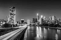 Ervaar het magische monochrome uitzicht van downtown Philadelphia bij nacht vanaf de South Street Bridge! Vanaf deze brug heb je een adembenemend uitzicht op de fonkelende skyline van de stad terwijl de lichten van de wolkenkrabbers de donkere hemel in schijnen. De Schuylkill River stroomt rustig onder je door en de Schuylkill River Boardwalk nodigt je uit voor een ontspannende wandeling langs het water. Het uitzicht op I76, de Schuylkill Expressway, die zich een drukke weg baant langs de rivieroever, is bijzonder fascinerend. De lichtsporen van voertuigen die 's nachts rijden geven het landschap een levendige dynamiek en benadrukken het bruisende leven in Philadelphia. De combinatie van de indrukwekkende skyline, de kalme rivier en het drukke verkeer creëert een unieke sfeer die zowel opwindend als rustgevend is.