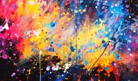 Een abstract schilderij vol dynamische vormen en kleuren is een visueel feest voor de ogen en biedt een zintuiglijke ervaring die rechtlijnige interpretatie tart. Het doek is een levendige speeltuin waar geometrische en organische vormen dansen en op elkaar inwerken, waardoor een gevoel van beweging en diepte ontstaat. Gedurfde, verzadigde kleuren zoals elektrisch blauw, vurig rood en lichtgevend geel botsen en harmoniëren op onverwachte manieren en dagen de waarneming en emoties van de kijker uit. Door de afwezigheid van herkenbare figuren of objecten worden de vormen en kleuren zelf het onderwerp, wat uitnodigt tot meerdere lagen van betekenis en interpretatie. Over het geheel genomen dient het schilderij als een verkenning van vorm, kleur en emotie, waarbij traditionele artistieke grenzen worden overschreden om een viscerale reactie op te roepen.