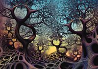 Een abstract schilderij vol dynamische vormen en kleuren is een visueel feest voor de ogen en biedt een zintuiglijke ervaring die rechtlijnige interpretatie tart. Het doek is een levendige speeltuin waar geometrische en organische vormen dansen en op elkaar inwerken, waardoor een gevoel van beweging en diepte ontstaat. Gedurfde, verzadigde kleuren botsen en harmoniëren op onverwachte manieren, waardoor de waarneming en emoties van de kijker worden uitgedaagd. Door de afwezigheid van herkenbare figuren of objecten worden de vormen en kleuren zelf het onderwerp, wat uitnodigt tot meerdere lagen van betekenis en interpretatie. Over het geheel genomen dient het schilderij als een verkenning van vorm, kleur en emotie, waarbij traditionele artistieke grenzen worden overschreden om een viscerale reactie op te roepen.