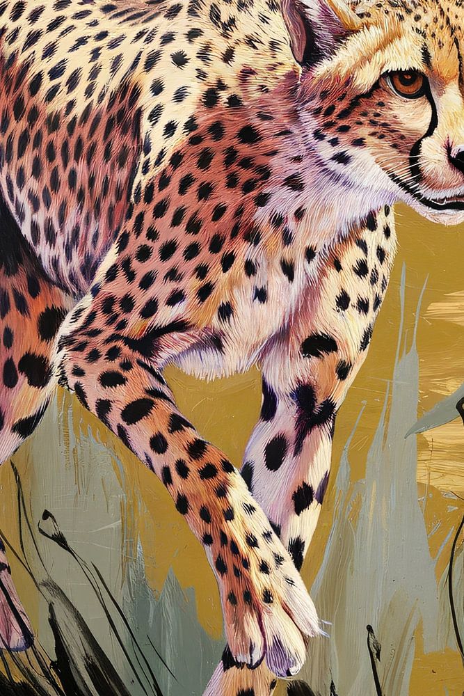 Een opvallend kunstwerk dat de elegantie en snelheid van een cheeta vangt in een dynamische, abstracte setting. Met levendige kleuren en vloeiende lijnen straalt het schilderij energie en kracht uit. Ideaal om een ruimte te vullen met beweging en levendigheid. Perfect voor liefhebbers van wilde dieren en moderne kunst.