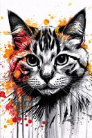 Dit prachtige ontwerp toont een intrigerende close-up van een kat, weergegeven in een modern en dynamisch kunstwerk. De zwart-witte details van de kat worden versterkt door levendige kleurspatten van oranje, rood en geel, wat het geheel een energieke en expressieve uitstraling geeft. De subtiele lijnen en vloeiende vormen van de kat contrasteren met de spontane verfsplashes, waardoor dit ontwerp perfect is voor een modern interieur. De ogen van de kat trekken direct de aandacht en lijken bijna levensecht, wat een gevoel van verbinding en mysterie oproept. Ideaal voor in een slaapkamer of kantoor, dit kunstwerk zal elke ruimte opfleuren en een modern, creatief accent geven. Het is een perfecte keuze voor liefhebbers van dieren en hedendaagse kunst.