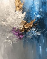 Dynamisch, modern en abstract in wit, blauw, goud en paars. Dit is een echte blikvanger voor je interieur! Kies zelf het formaat en materiaal en maak het passend naar jouw wens.