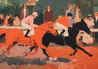 Dit levendige schilderij toont een dynamische paardenrace in krachtige, impressionistische penseelstreken. Twee paarden staan op de voorgrond: het ene fel oranje, het andere gitzwart, beide in volle galop. De jockeys dragen felle kleding en zitten geconcentreerd in het zadel, terwijl de toeschouwers in gedempte kleuren op de achtergrond…