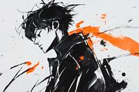 Een krachtig silhouet met een wilde haardos trekt de aandacht van de kijker, omringd door dynamische kleurspatten in fel oranje. Deze expressieve compositie straalt energie en zelfvertrouwen uit en is perfect als statement kunstwerk voor een creatief kantoor of een moderne leefruimte die vraagt om inspiratie.