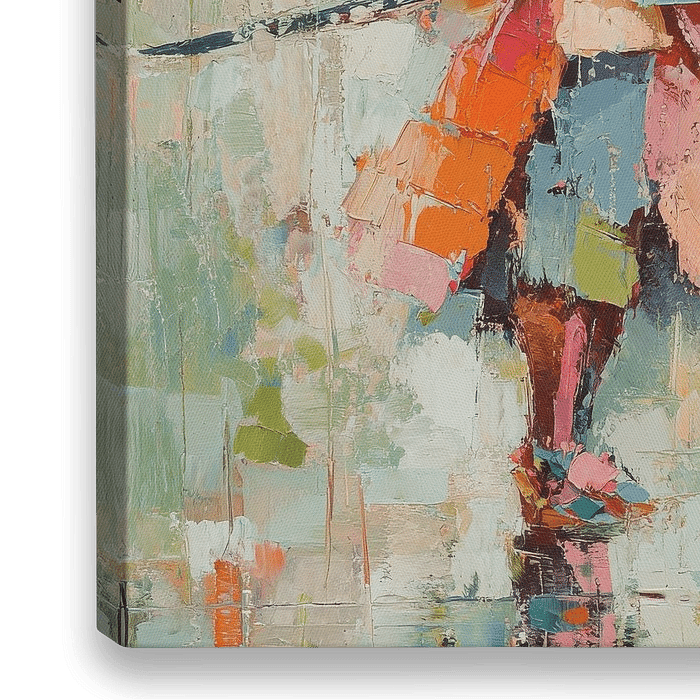 Een expressief schilderij van een gestileerde samoeraifiguur in een dynamische pose. De figuur is zijwaarts naar rechts gedraaid, armen uitgestrekt, benen licht gebogen, draagt een kleurrijke kimono in oranje, roze, blauw en groen met zichtbare textuur. In haar handen houdt ze een lang, donkerkleurig zwaard diagonaal over haar lichaam.…