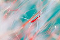 Deze foto is gemaakt van een bol met draden van glas, gemaakt door een glasblazer. Het rode accent valt mooi op tegen de turquoise achtergrond.