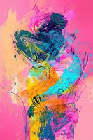Dynamische Abstractie met Beweging - In dit abstract schilderij zie je een dynamische compositie met felle kleuren zoals roze, blauw en geel die samenkomen in een expressieve, vloeiende vorm die de indruk wekt van beweging en energie.
