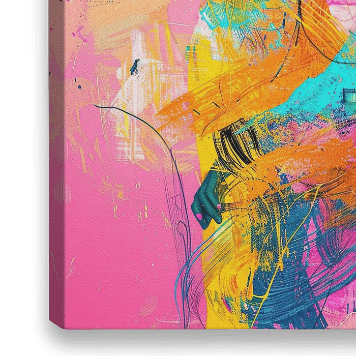 Dynamische Abstractie met Beweging - In dit abstract schilderij zie je een dynamische compositie met felle kleuren zoals roze, blauw en geel die samenkomen in een expressieve, vloeiende vorm die de indruk wekt van beweging en energie.