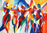 Dit opmerkelijke kunstwerk toont vier dansers boven elkaar, gepresenteerd in een stijl die kleurrijke abstractie, herhaling van vormen en dynamische symmetrie combineert. Het levendige colorisme en de heldere sculpturale elementen geven het werk een explosie van energie en beweging.