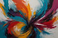 Dit levendige kunstwerk is een symfonie van kleur, waarbij elke penseelstreek een eigen verhaal lijkt te vertellen. Met een dynamisch palet dat uiteenloopt van diep rood tot zonnig geel, koel blauw en tinten zwart en wit, vangt dit ontwerp de essentie van beweging en energie. Het is alsof je kijkt naar een dans van kleuren die zich met…