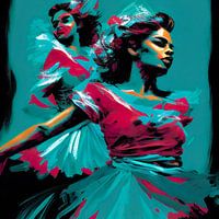 De verfstreken zijn dynamisch en energiek, waardoor de beweging van de danseres wordt benadrukt. De felle kleuren, zoals rood, geel en zwart, voegen nog meer leven en intensiteit toe aan het tafereel. Het lijkt alsof de kleuren vibreren en pulseren, net als de muziek  die de danseressen begeleid.