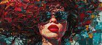 Dynamische Kleuren Wirwar | Modern Portret - Dit expressieve schilderij vangt je blik met een portret van een vrouw verstrengeld in een levendige wirwar van kleurrijke en dynamische penseelstreken. De ferme textuur en de cohesie van rood- en blauwtinten, gecombineerd met accenten van geel en wit, brengen een energieke sfeer die een modern interieur ongetwijfeld zouden verlevendigen. De abstracte benadering geeft een edgy twist aan traditionele portretkunst.