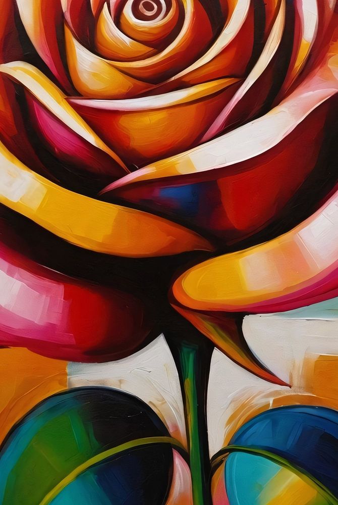 Dit expressieve kunstwerk vangt de essentie van een roos in een niet-traditioneel licht. De levendige kleuren spatten van het doek af, waarbij elke penseelstreek bijdraagt aan de dynamische en moderne uitstraling van de roos. De achtergrond, een mozaïek van abstracte vormen en contrasterende tinten, benadrukt de schoonheid van de bloem. Dit stuk zou een gesprekspunt zijn in elk interieur, ideaal voor een woonkamer of een kunstzinnige kantoorruimte. Het is een ode aan de natuur, vertaald in de taal van de moderne kunst, een statement piece dat warmte en creativiteit ademt.