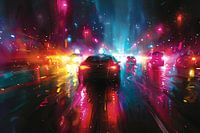 Dit levendige kunstwerk dompelt je onder in een dynamische stedelijke scene, verlicht door de schitterende neonlichten van een bruisende stad. Kleurrijke lichten reflecteren op natte straten, waar autos en stadsgebouwen een futuristische gloed werpen tegen de nachtelijke hemel. Perfect voor de moderne interieur liefhebber, brengt dit…