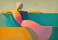 Dynamische Pose - Dit abstracte schilderij toont een gestileerde menselijke figuur in een dynamische pose, uitgebeeld met vloeiende, geometrische vormen en levendige, contrasterende kleuren.