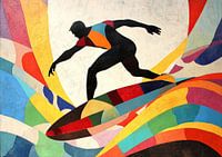 Dynamische Surfer in Heldere Kleuren - Op dit schilderij zie je een surfer die soepel op een kleurrijke golf staat, met een krachtige uitstraling en een dynamische houding die de energie van het surfen vastlegt.