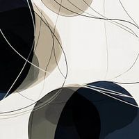 Abstracte compositie, gekenmerkt door een samenspel van overlappende vormen en lijnen. De voorstelling bestaat uit een minimalistisch kleurenpalet van voornamelijk neutrale tinten, met gebruik van zwart, wit en verschillende grijstinten, wat zorgt voor een kalme en gebalanceerde uitstraling. De grote, vloeiende vormen lijken in beweging, en creëren een gevoel van diepte en dynamiek binnen het tweedimensionale vlak. De onregelmatige, organische lijnen contrasteren met de stevige geometrische vormen en voegen een element van spontaniteit toe aan het stuk. Het is een hedendaags stuk dat zich thuis zou voelen in een moderne of minimalistische inrichting.