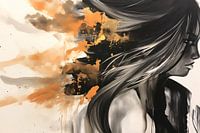 Dit dynamische kunstwerk laat een vrouw zien die zich afwendt, omgeven door een storm van kleur en beweging. Het zwart-witte contrast van de figuur tegen de achtergrond versterkt de visuele impact. Oranje en gouden tinten brengen een eplosie van energie en passie, terwijl het lijnenspel van haar haren een gevoel van kracht en vrijheid…