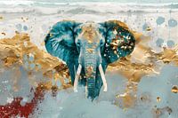 Deze prachtige digitale kunstwerk brengt een olifant tot leven in een explosie van kleuren en texturen. Het combineert elementen van abstract expressionisme en dynamische kunst, waarbij de olifant centraal staat te midden van spatten van blauw, goud en wit. Het schilderij straalt energie en vitaliteit uit, perfect voor moderne interieurs en kantoren. De golvende zee op de achtergrond voegt een gevoel van rust en eindeloosheid toe, wat een boeiende tegenstelling creëert met de levendige kleuren van de olifant. Dit kunstwerk is een eyecatcher die elke ruimte opfleurt en een gevoel van avontuur en natuur oproept.