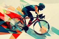 De dynamiek van het fietsen ontvouwt zich in een krachtig moment van snelheid en passie. Geometrische vormen in felle kleuren omlijsten de fietser, die zich vastberaden op de toekomst stort. Elk detail straalt energie uit terwijl de wind door de gebogen lijnen van zijn bewegingen strijkt en de vrijheid van het fietsen belichaamt.